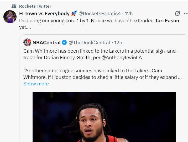 北京时间7月4日凌晨,因为湖人记者安东尼-劳瑞恩报道,惠特莫尔可能会在KD7方大交易中被送到洛杉矶,白魔成为火箭先签后换芬尼史密斯的一部分。这让太阳媒体HTE挑事儿:请注意火箭正在送出他们的年轻资产,塔里-伊森都还没有达成续约。(HTE的头像是杰伦-格林太阳球衣)