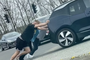 据悉,这起事件发生在克拉姆灵顿的摩尔农场环岛,距离纽卡斯尔圣詹姆斯公园球场约10英里。一段来自附近车内的视频显示,身穿T恤短裤的伯恩正与另外两人合力推车,他弓着背使尽全力的模样格外醒目。